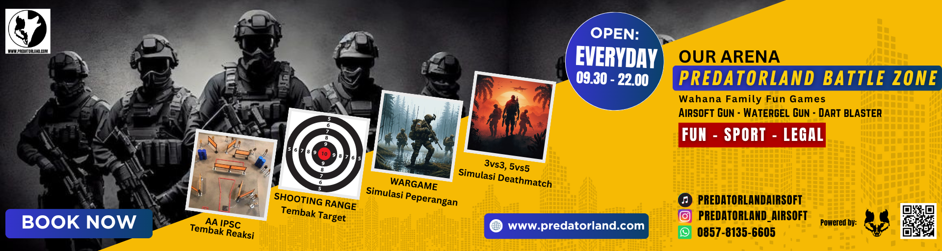 Predatorland adalah Arena Permainan Airsoftgun, Water Gell, dan Nerf Indoor terbesar di Indonesia. Dengan luasan lebih dari 2500m2, kami mempunyai beberapa macam arena seperti; Arena Wargame, Arena 3on3, AAIPSC, & Shooting Range.